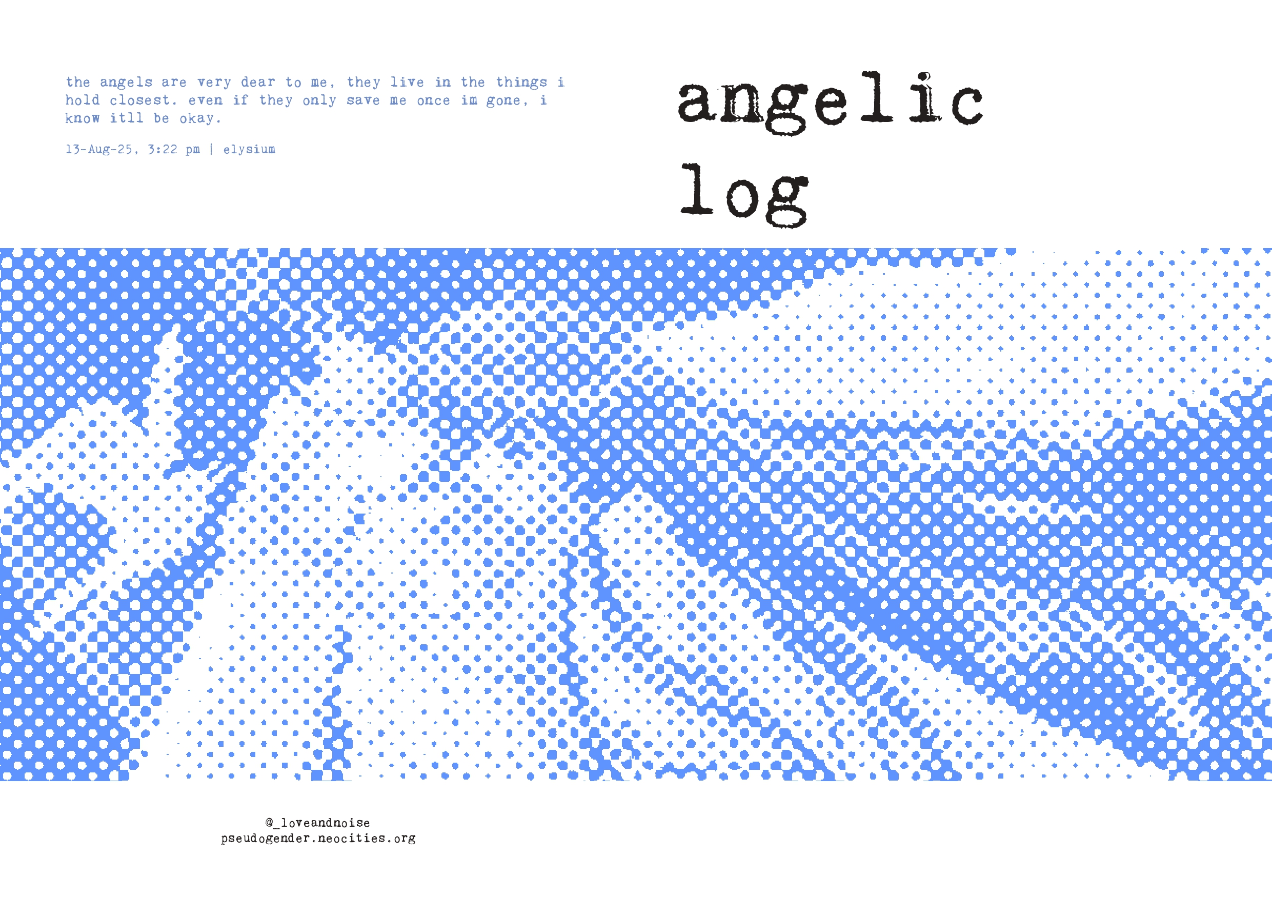 all text from “angelic log” a 'guestbook' inviting any user to share any spiritual experiences. 'spiritual experience' is not given a concrete definition more than what it already means to the viewer.